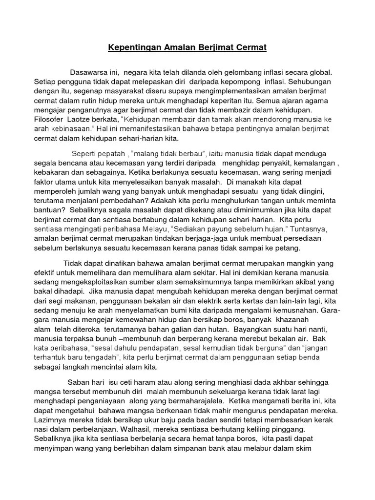 Dengan program ini, pengguna dapat berjimat cermat untuk membeli barangan keperluan yang lebih utama seperti peribahasa yang menyebut ingat sebelum kena jimat sebelum habis. Sebab itulah, korang kena berdisiplin dalam menggunakan kad kredit kerana jika salah penggunaannya ia ibarat kanser yang boleh memakan diri untuk jangka yang panjang. Secara keseluruhannya, usaha memupuk amalan berjimat cermat ini, bukanlah hanya terletak pada bahu ibu bapa sahaja malah kerjasama. Keadaan ini boleh digambarkan seseorang menyediakan payung sebelum hujan. Jan 30, 2022 · karangan pendek: Apabila dewasa, ideologi ini akan terus diwariskan.